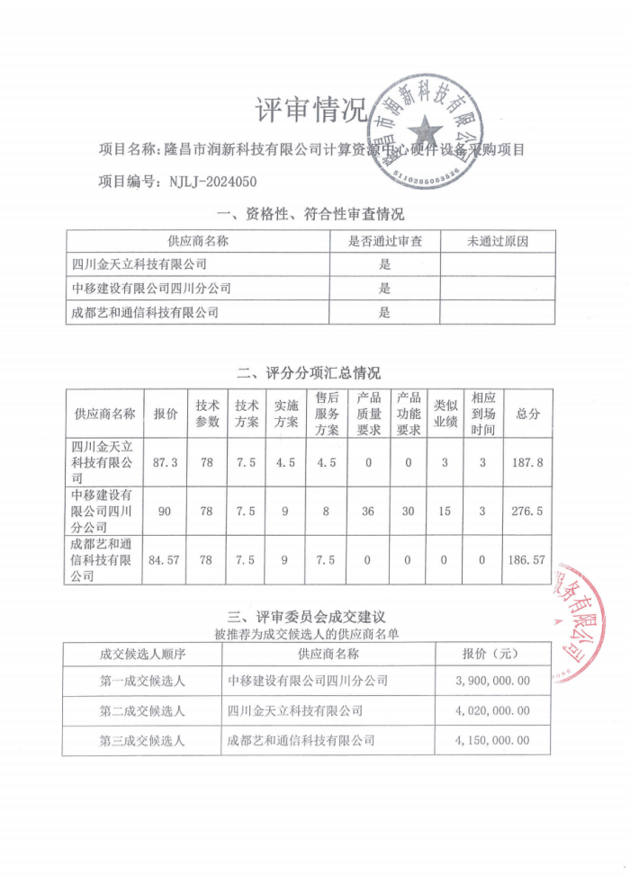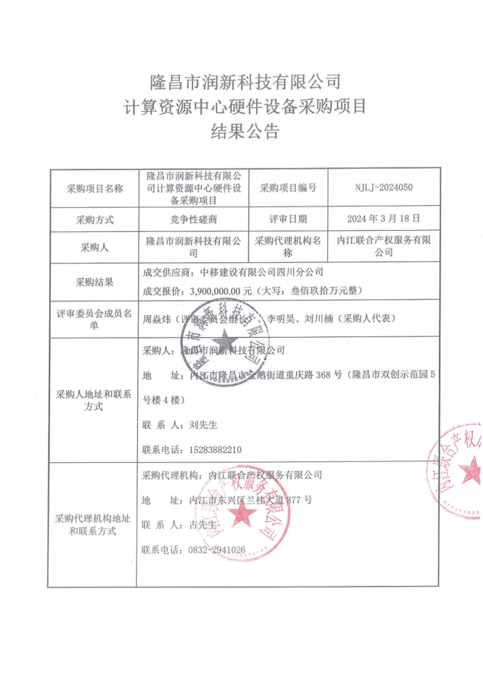 隆昌市潤新科技有限公司計(jì)算資源中心硬件設(shè)備采購項(xiàng)目結(jié)果公告