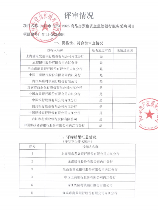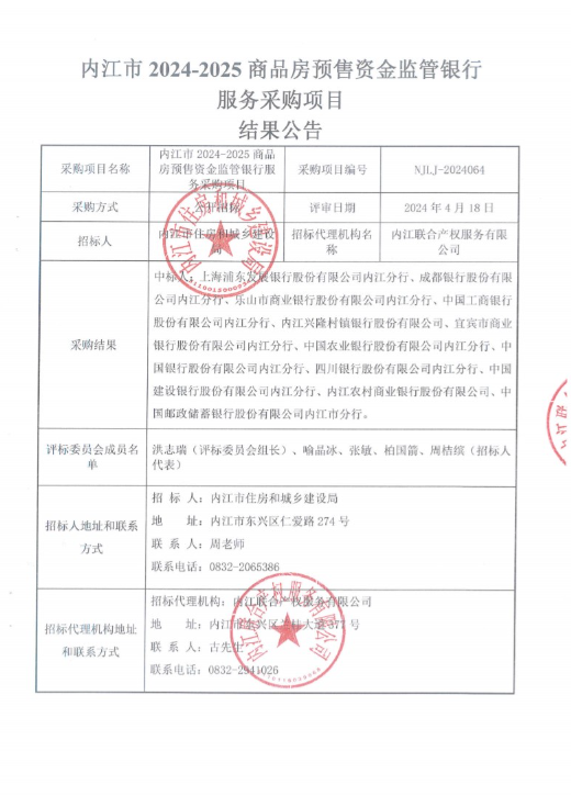 內(nèi)江市2024-2025商品房預(yù)售資金監(jiān)管銀行服務(wù)采購(gòu)項(xiàng)目結(jié)果公告