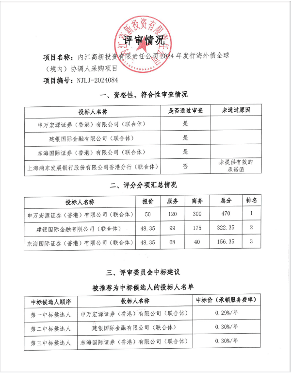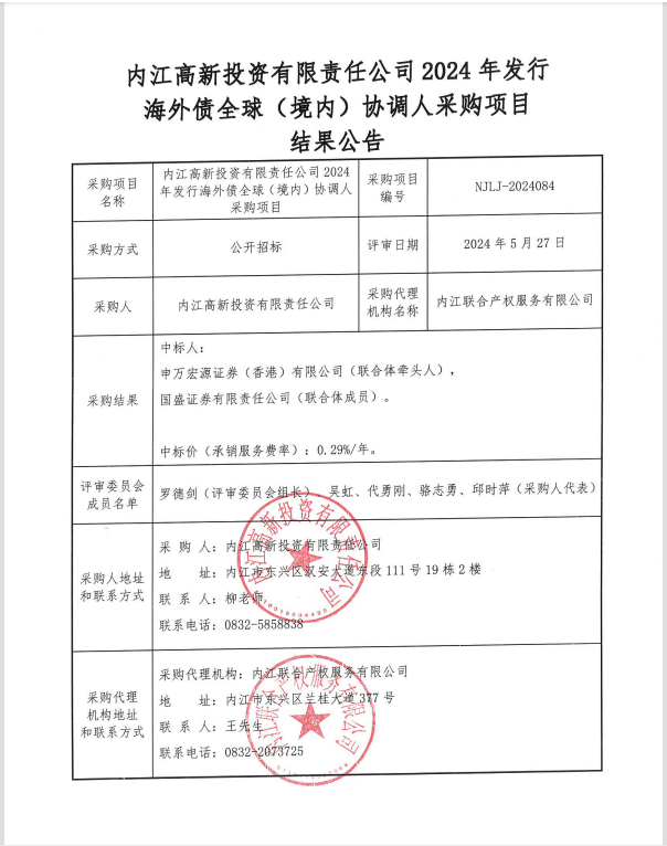 內(nèi)江高新投資有限責(zé)任公司2024年發(fā)行海外債全球(境內(nèi))協(xié)調(diào)人采購項(xiàng)目結(jié)果公告