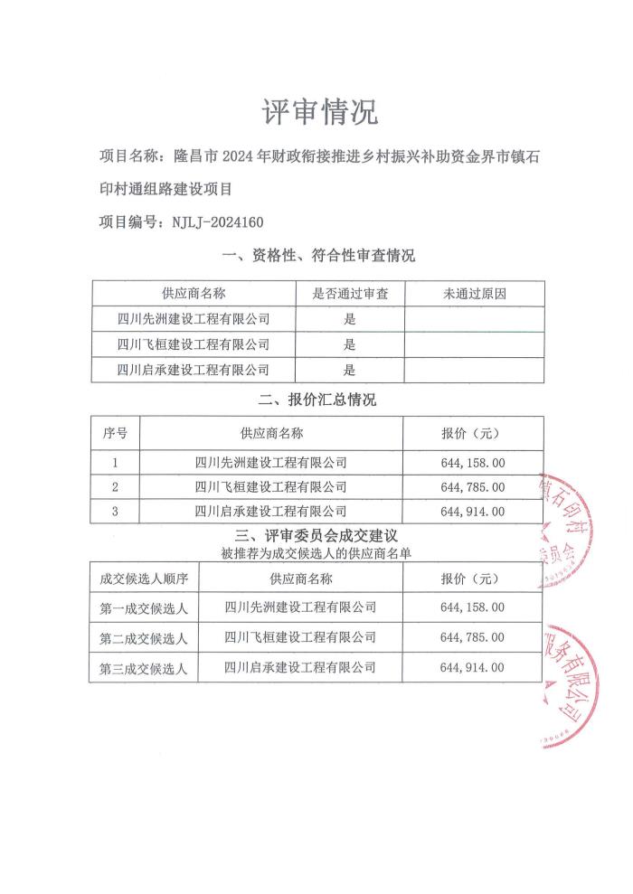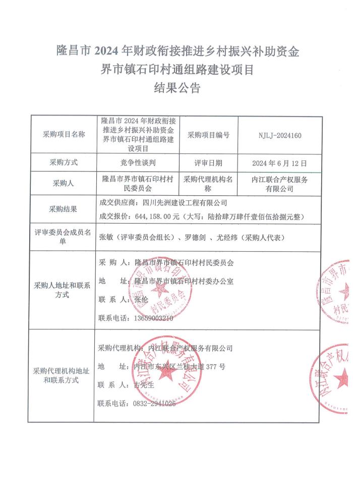 隆昌市2024年財(cái)政銜接推進(jìn)鄉(xiāng)村振興補(bǔ)助資金界市鎮(zhèn)石印村通組路建設(shè)項(xiàng)目結(jié)果公告