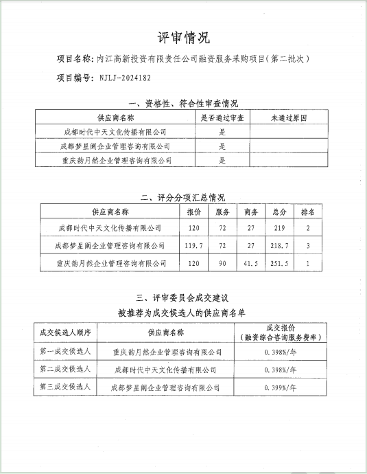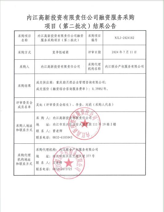 內(nèi)江高新投資有限責(zé)任公司融資服務(wù)采購項(xiàng)目(第二批次)結(jié)果公告