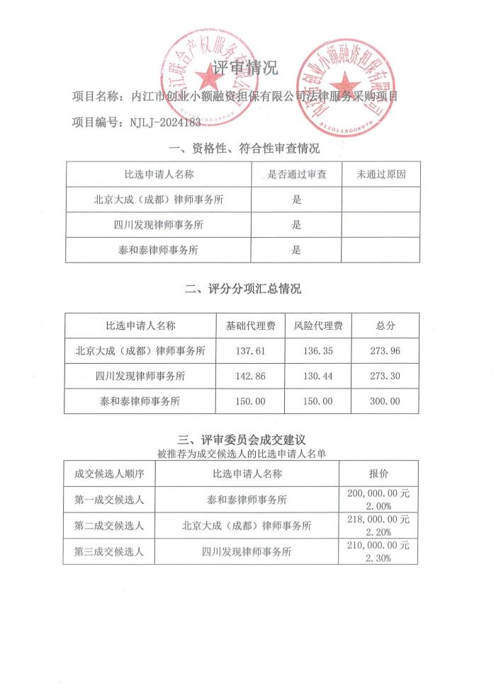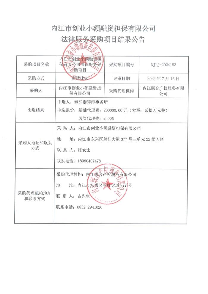內(nèi)江市創(chuàng)業(yè)小額融資擔保有限公司法律服務(wù)采購項目結(jié)果公告