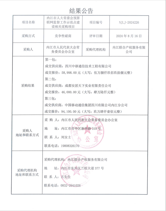 內(nèi)江市人大常委會預算聯(lián)網(wǎng)監(jiān)督工作示范點建設(shè)相關(guān)采購項目結(jié)果公告