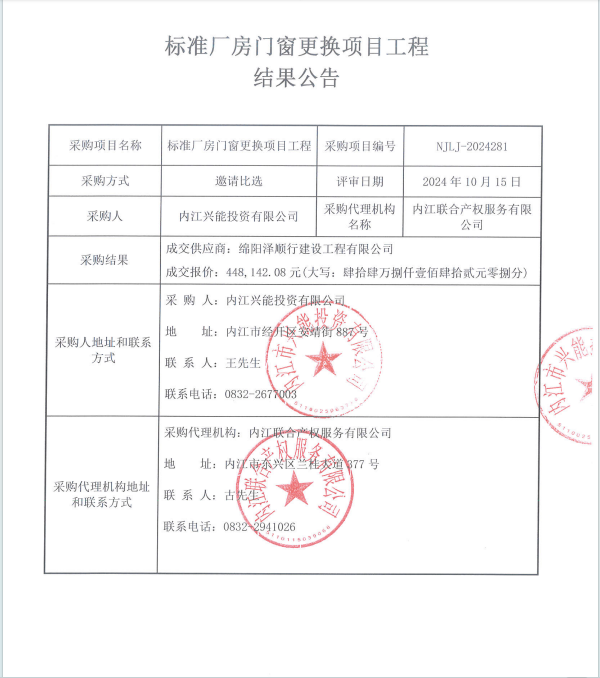 標(biāo)準(zhǔn)廠(chǎng)房門(mén)窗更換項(xiàng)目工程結(jié)果公告