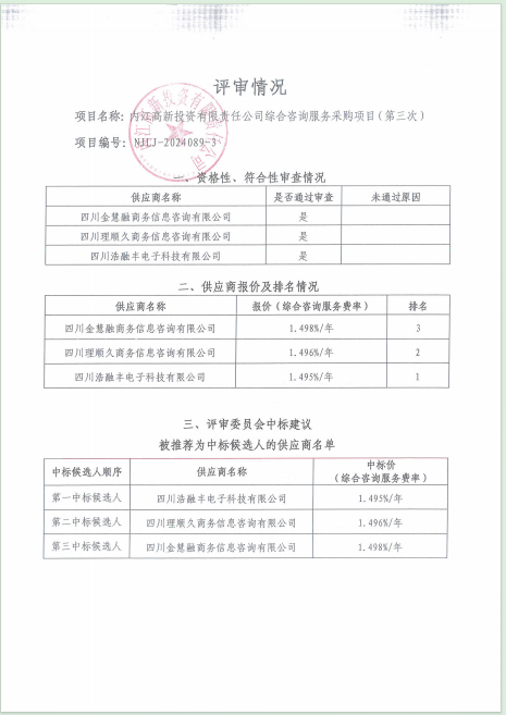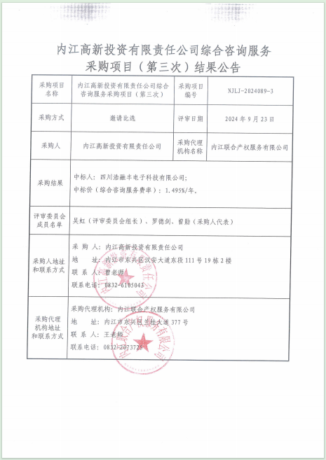 內(nèi)江高新投資有限責(zé)任公司綜合咨詢服務(wù)采購項目(第三次)結(jié)果公告
