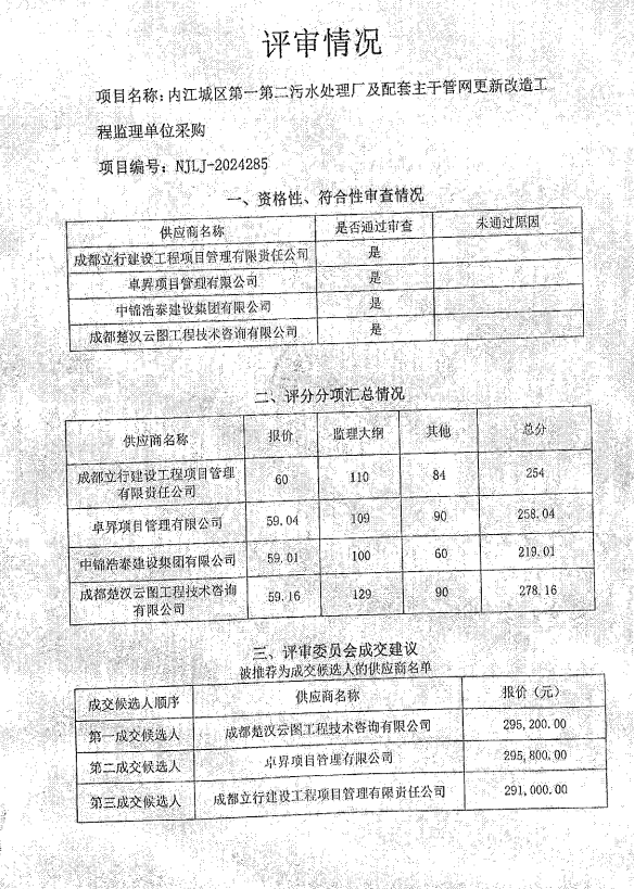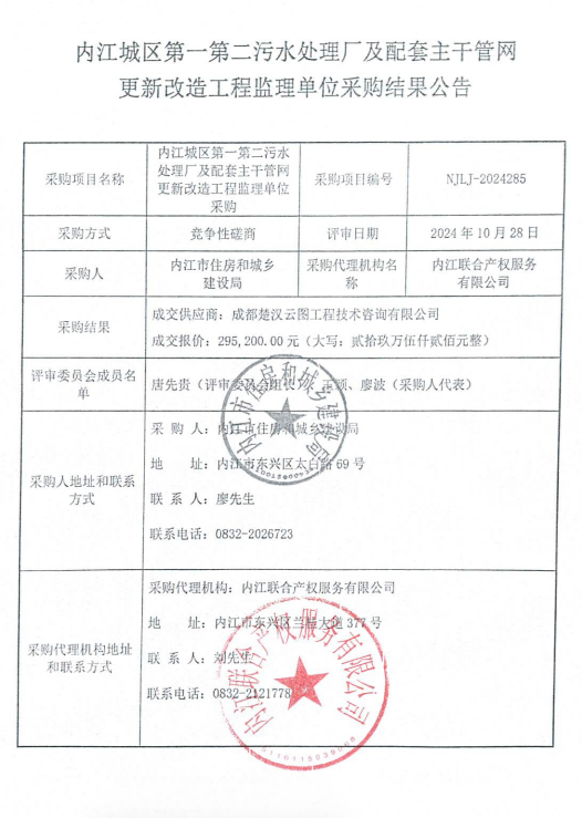 內(nèi)江城區(qū)第一第二污水處理廠及配套主干管網(wǎng)更新改造工程監(jiān)理單位采購結(jié)果公告