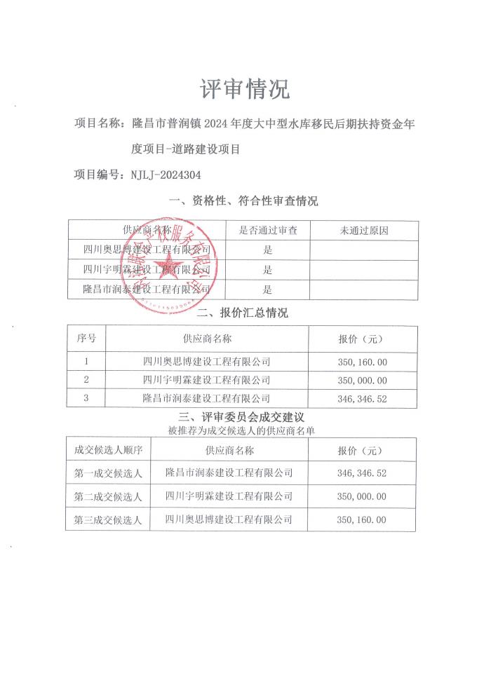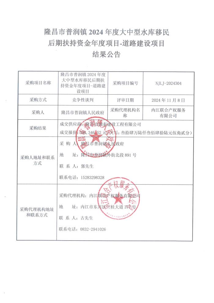 隆昌市普潤鎮(zhèn)2024年度大中型水庫移民后期扶持資金年度項目-道路建設項目結果公告