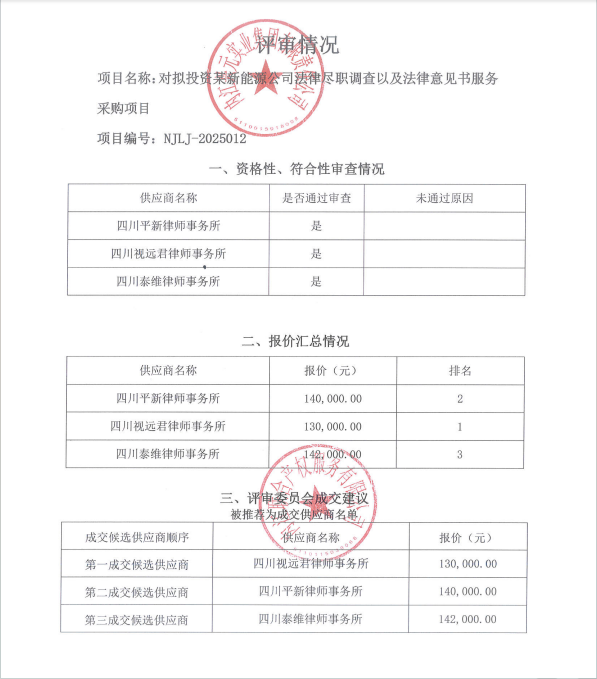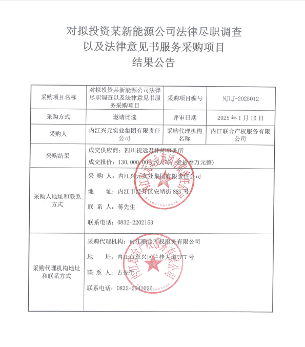 對擬投資某新能源公司法律盡職調(diào)查以及法律意見書服務(wù)采購項(xiàng)目結(jié)果公告