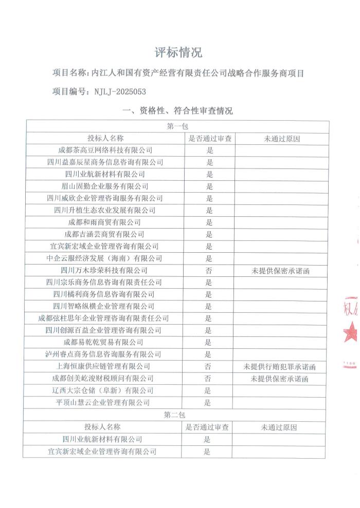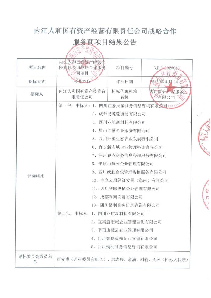 內(nèi)江人和國有資產(chǎn)經(jīng)營有限責(zé)任公司戰(zhàn)略合作服務(wù)商項目結(jié)果公告