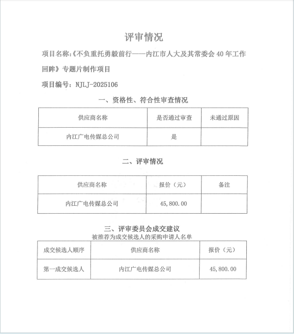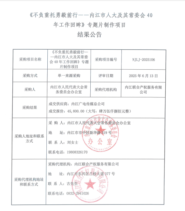 《不負重托勇毅前行——內(nèi)江市人大及其常委會40年工作回眸》專題片制作項目結(jié)果公告