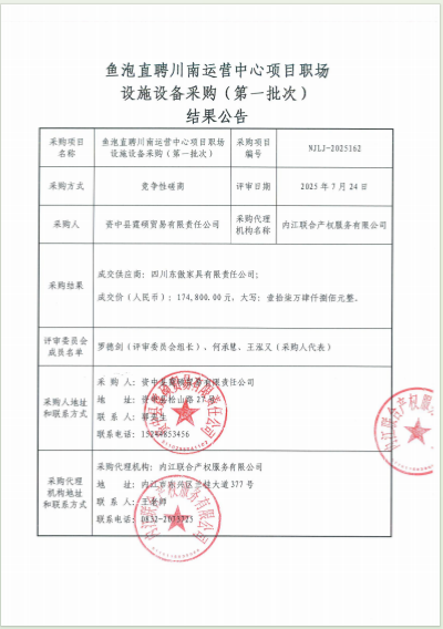 魚泡直聘川南運(yùn)營(yíng)中心項(xiàng)目職場(chǎng)設(shè)施設(shè)備采購(gòu)(第一批次)結(jié)果公告