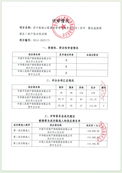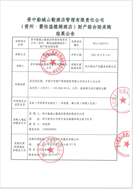 資中船城山歌酒店管理有限責(zé)任公司(資州·爵怡溫德姆酒店)財(cái)產(chǎn)綜合險(xiǎn)采購(gòu)結(jié)果公告