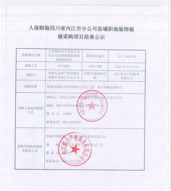 人保財(cái)險(xiǎn)四川省內(nèi)江市分公司縣域職場(chǎng)裝飾裝修采購項(xiàng)目結(jié)果公示